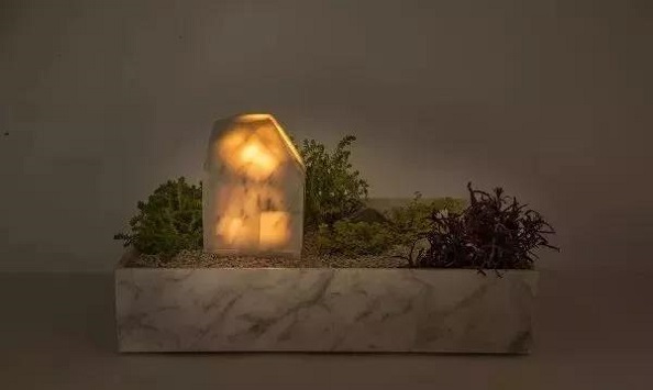 Mökki是一款将灯和花盆融合到一起的景观灯,花盆和灯罩都采用大理石做成,灯罩里面有LED光源,光线透过大理石之后变得更加柔和。灯罩的造型像是一座小房子,而花盆以及花盆里面的绿植好比是庭院和树木,共同组成一个完整的迷你景观。
