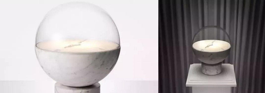 这个可爱的球形灯是由半球形的卡拉拉大理石基座和圆顶状铅水晶冠顶组成。球体直径40厘米,基座内部装有LED灯泡发出亮光,投射在卡拉拉大理石表面,呈现出大理石独特的纹理。