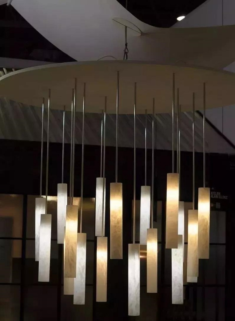 由于重量的限制,天然石材很少用于在天花板上,而这盏吊灯试图挑战这一印象。向下的折边,给人提供一种包容感,当几个成一组,高低不同悬挂时,带给人强烈的动感和强烈感。
